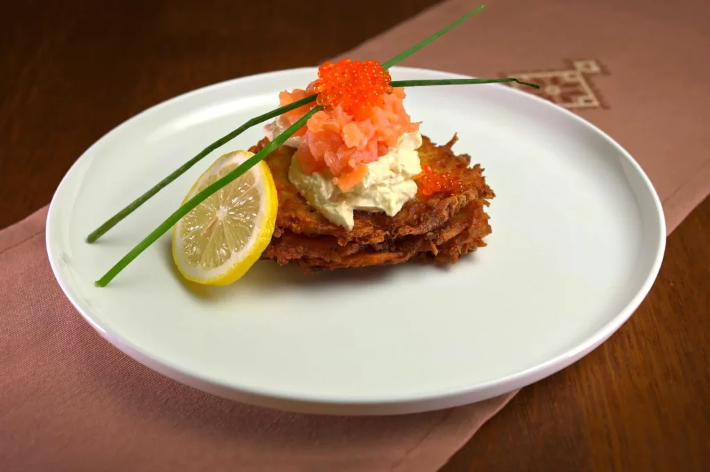 Mehl, Milch, Hühnerei, leicht gesalzener und mild geräucherter Lachs, roter Kaviar, Frischkäse, Dill, Schmand