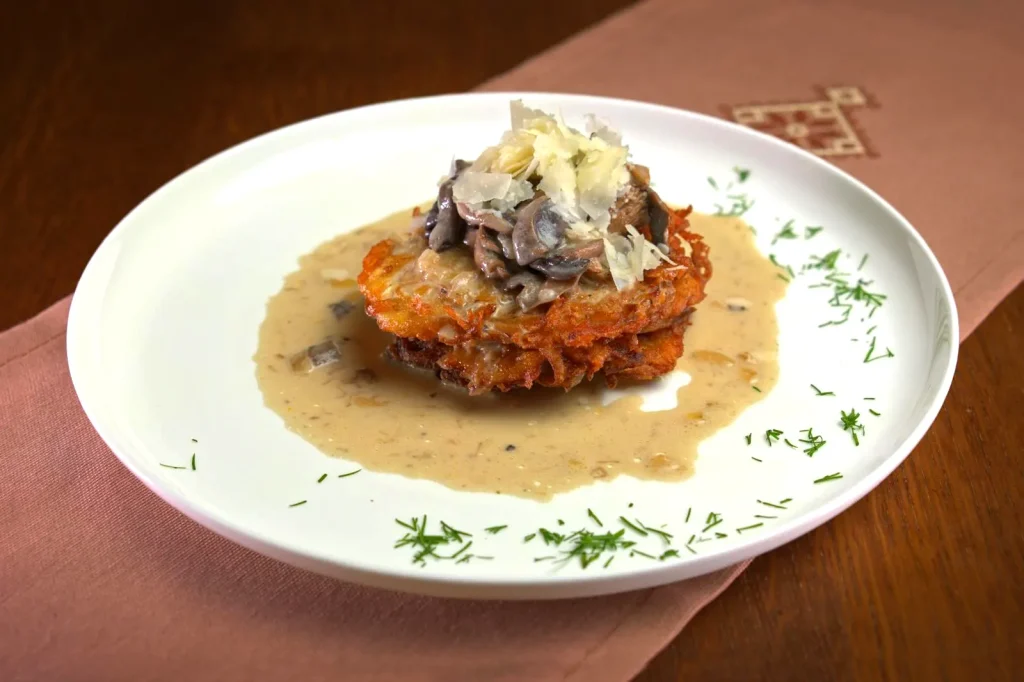 16.50€Kartoffeln, Hühnereier, Mehl, Geräucherter Lachs, Zitrone, Creme-Käse mit Dill, SchmandDeruny mit Pilzen und Waldpilz-Soße vegetarisch