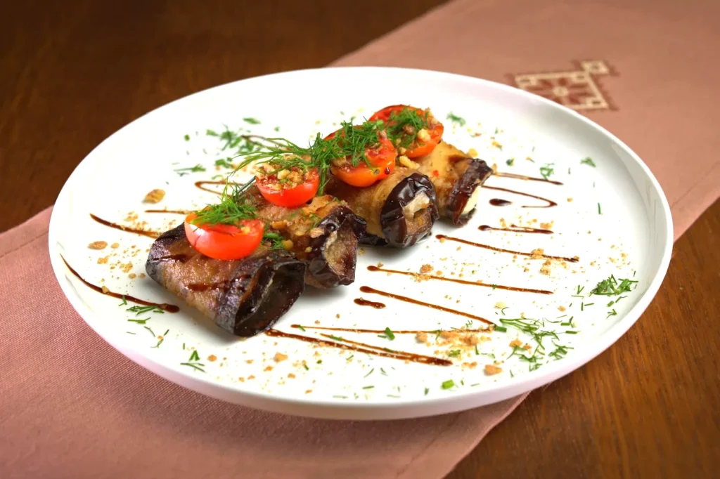 17.50€Kalbfleisch, Thunfisch, Eigelb, Sardellen, Kapern, Mayonnaise, Zitronensaft, OlivenölAuberginenröllchen mit Frischkäse, Tomaten und Walnüssen vegetarisch