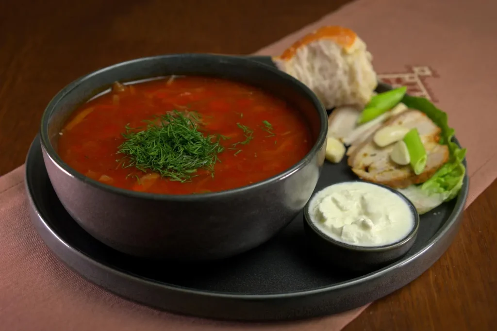 Borschtsch mit Pampuschki, Speck, Knoblauch und Schmand