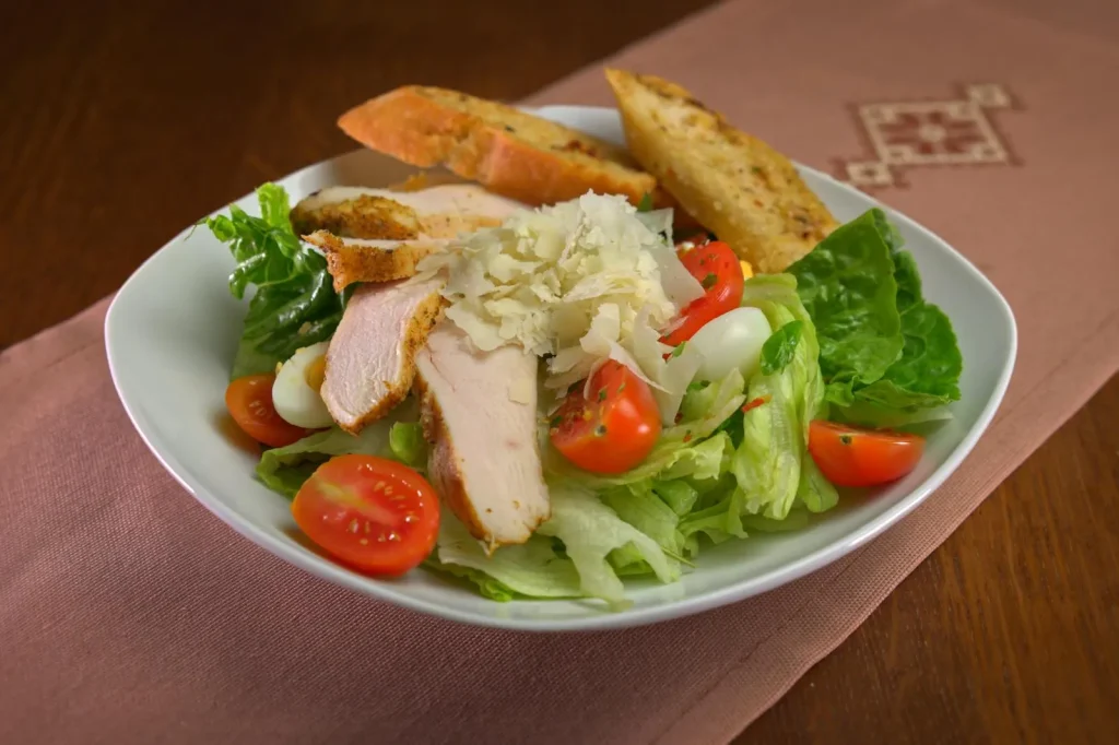 gebackenes Hähnchenfilet oder gebratene Garnelen, Römersalat oder Eisbergsalat, gekochtes Wachtelei, Parmesankäse, Baguette, Olivenöl, Kirschtomaten, Caesar-Dressing