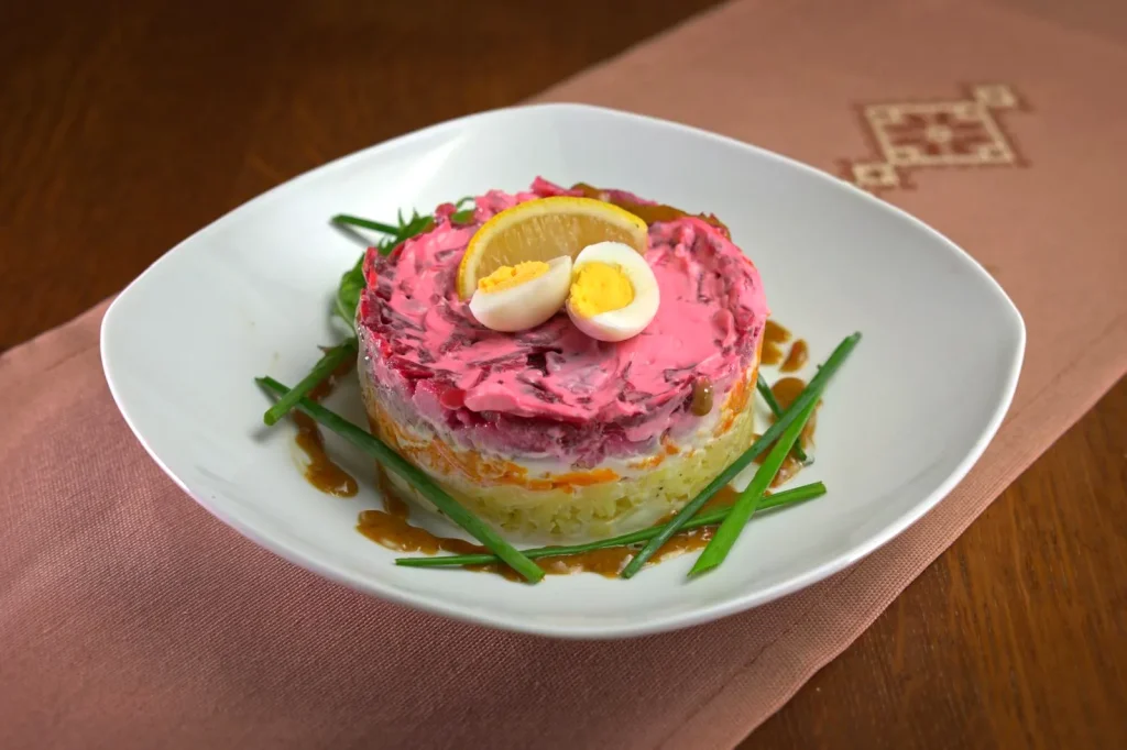 14.00€Cherrytomaten, Gurken, Paprika, rote Zwiebeln, Oliven, Fetakäse, Salatmischung, Olivenöl, OreganoHering im Pelzmantel mit Lachs