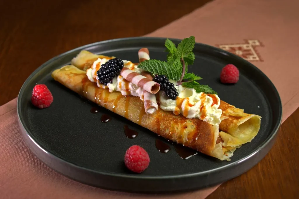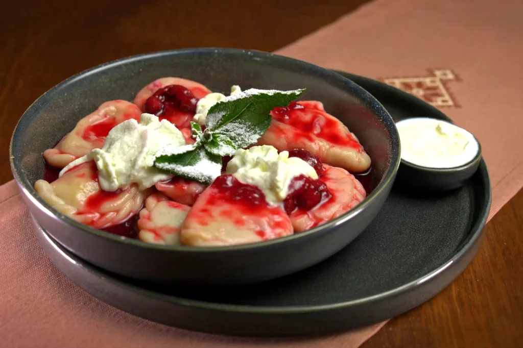 8.50€Mehl, Hühnerei, Butter, Apfel, Eis, Karamell, Nüsse, FrüchteMlyntsi mit Kirschen und Kirschsoße vegetarisch