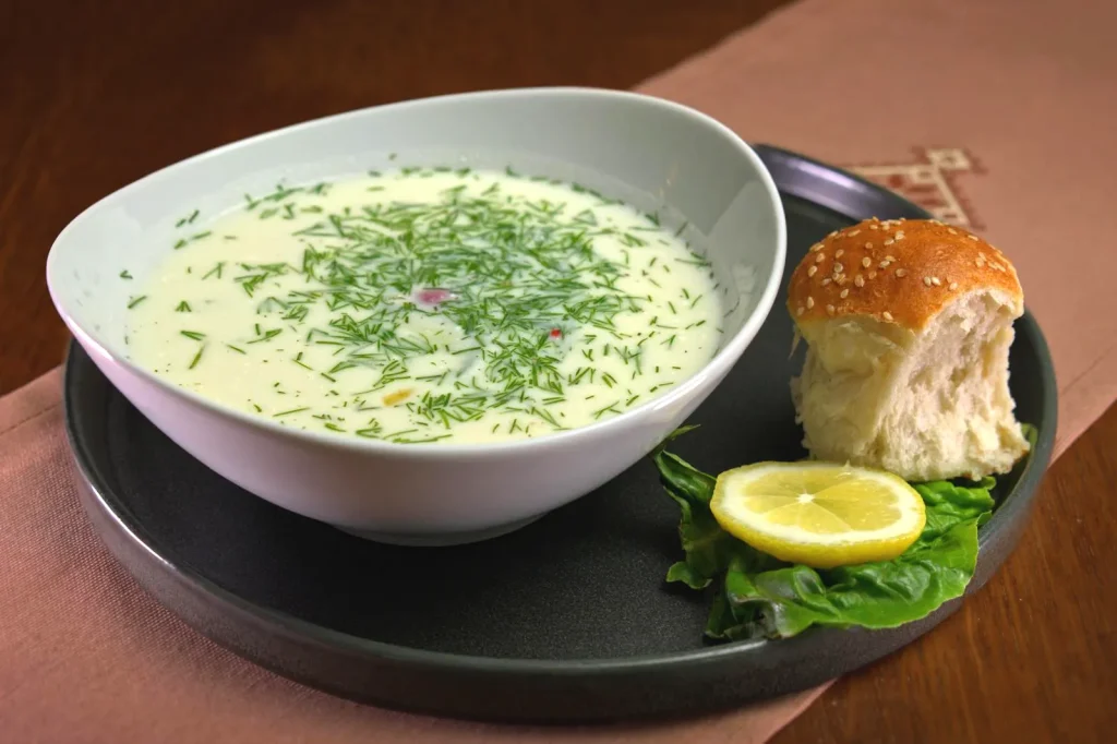 8.50€Auberginen, Frischkäse, Cherrytomaten, Salatmischung, Walnüsse, FruchtsauceOkroschka – Kalte Sommersuppe mit Hähnchen und Gemüse (Saisonangebot)