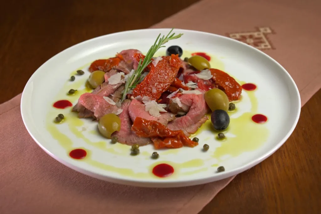 16.80€Rindfleisch, Kirschsauce, Cherrytomaten, Salatmischung, TrüffelölVitello Tonnato – Kalbsfleisch mit Thunfischsauce