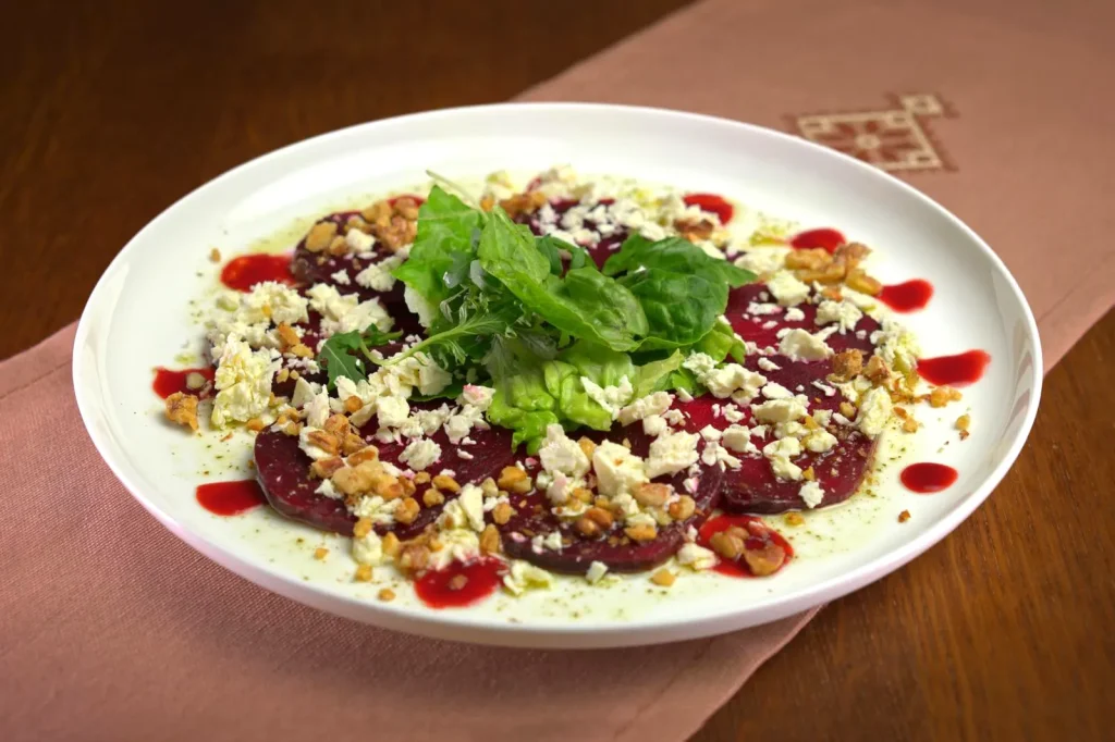 16.00€Auberginen, Frischkäse, Cherrytomaten, Salatmischung, Walnüsse, FruchtsauceRote-Bete-Carpaccio mit Rucola, Walnüssen und Zitrus-Dressing vegetarisch