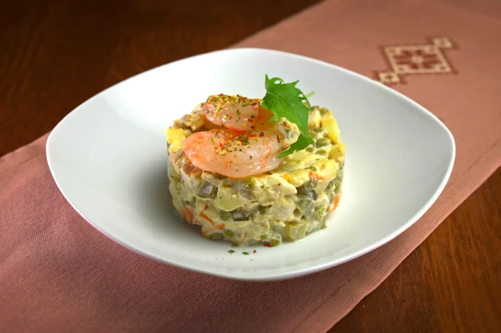 14.50€gekochtes Gemüse: Kartoffeln, Rote Bete und Karotten, dazu gekochtes Ei, mild gesalzener Hering, mild geräucherter Lachs, marinierte rote Zwiebel, MayonnaiseSalat „Olivier“ mit Garnelen und Wachtelei