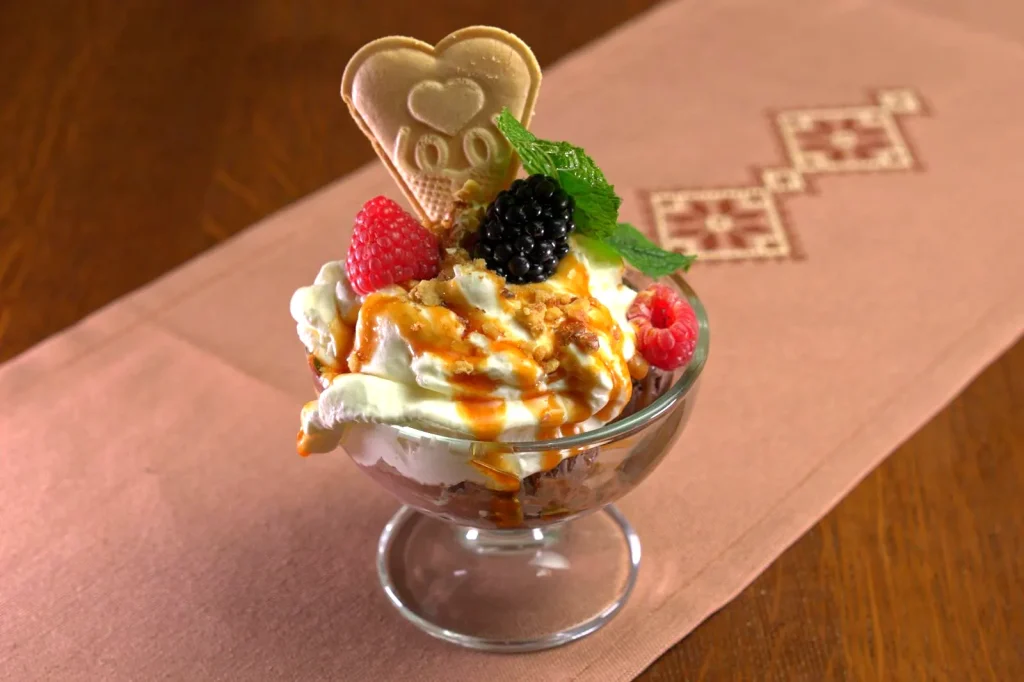 6.80€Vanilleeis, Schokoladeneis, Schokosoße, Nüsse, SchlagsahneWarenyky mit Kirschen und Schlagsahne vegetarisch