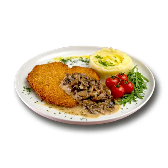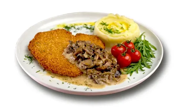 22.00€Куряче філе, вершкове масло, кріп, панірувальні сухарі панко ...Свинячий шніцель з картопляним пюре