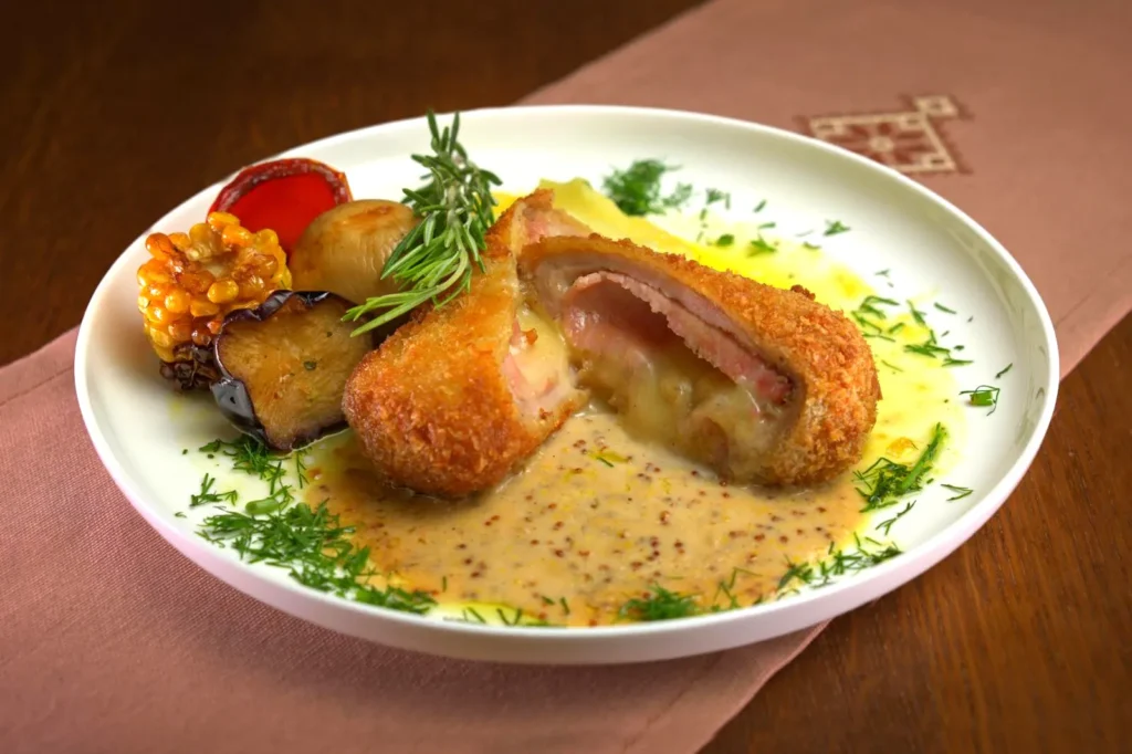Куряче філе, шинка, сир чеддер, пшеничне борошно, курячі яйця, панірувальні сухарі панко, вершково-гірчичний соус