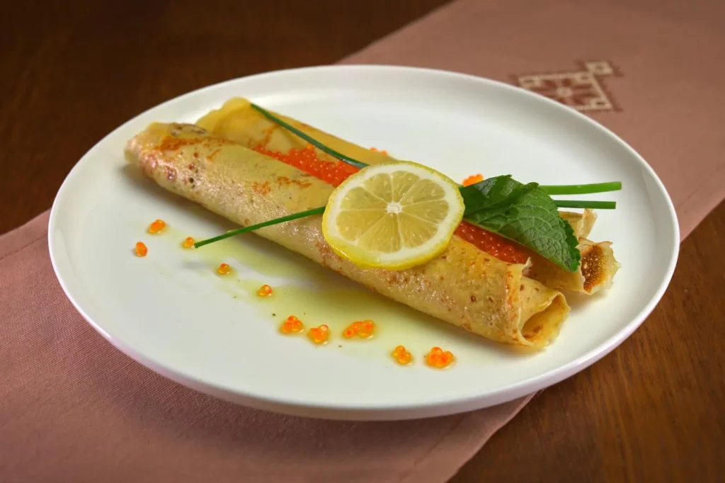 Борошно, молоко, куряче яйце, легкосолений і м’яко копчений лосось, червона ікра, крем-сир, кріп, сметана
