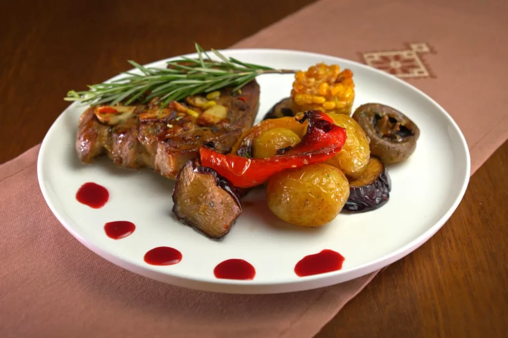 Свинячий стейк зі свинячої шиї, часник, свіжий розмарин, оливкова олія, лимон, баклажан, перець, помідори чері, цибуля, картопля, вишневий соус, зелень, кукурудзяний крохмаль, винний оцет