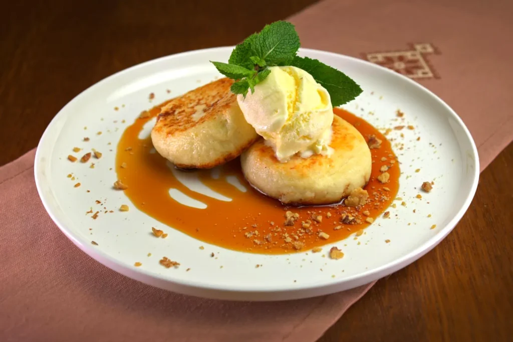 Творог, куряче яйце, пшеничне борошно, манка, ванільний цукор, масло, сметана, карамельний соус, шоколадний соус, ванільне морозиво