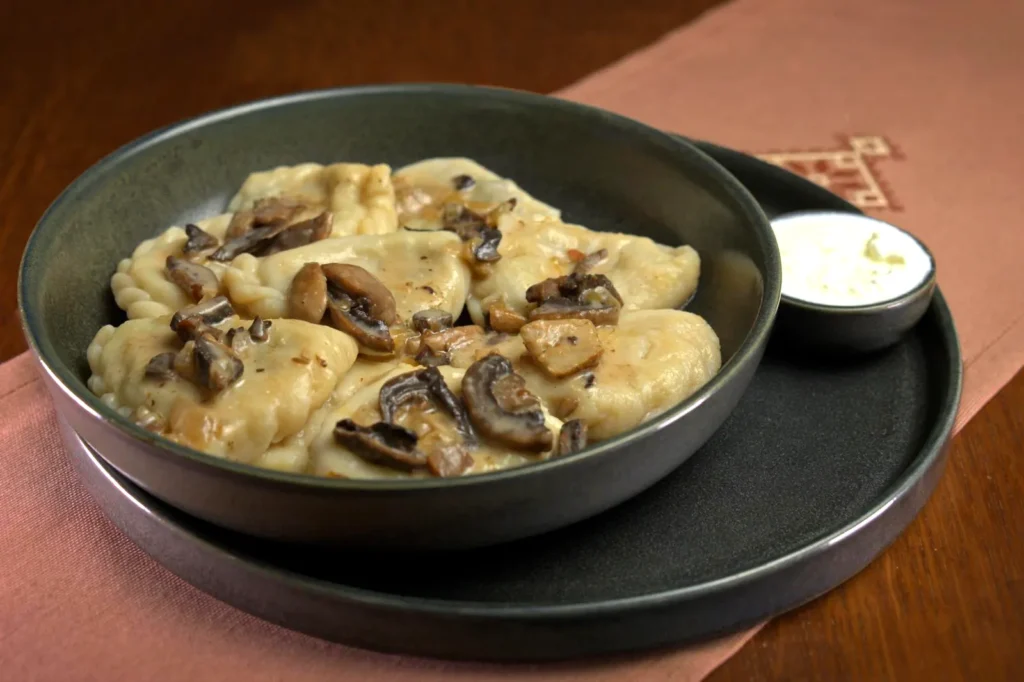 Вареники з картоплею та грибами в соусі з лісових грибів вегетаріанські